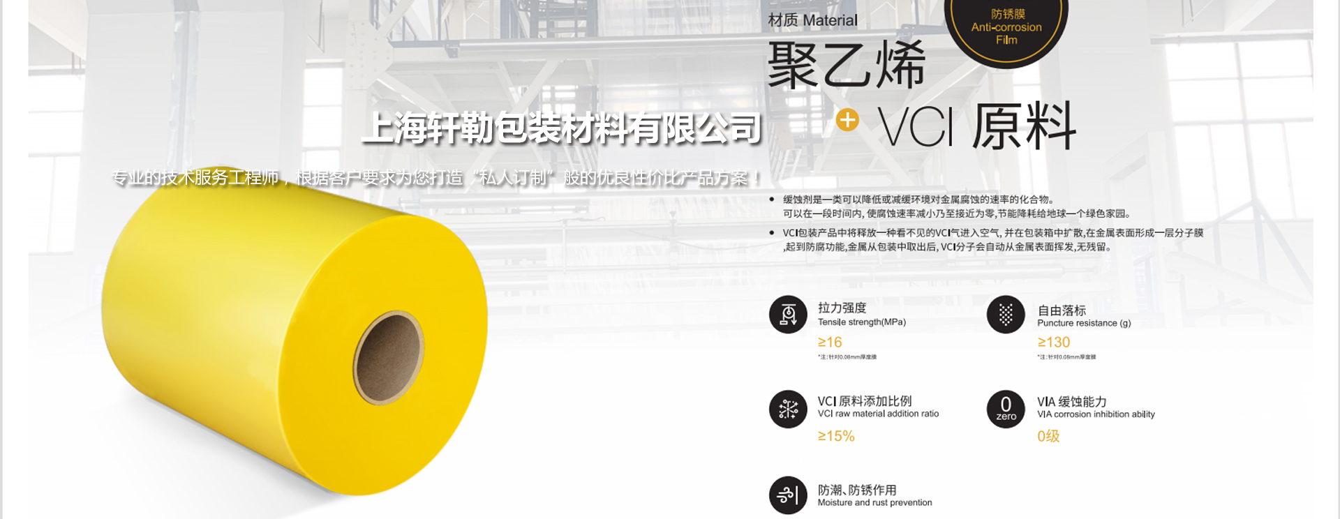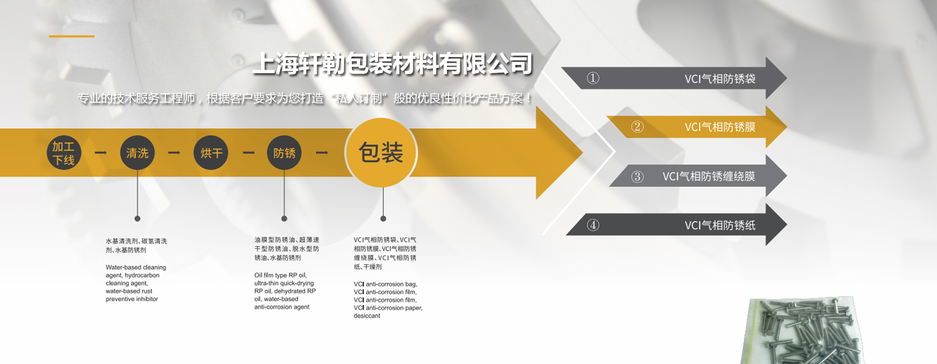 上海軒勒包裝材料有限公司是一家集研發(fā)、生產(chǎn)與銷(xiāo)售為一體的公司,是國(guó)內(nèi)工業(yè)包裝的新新企業(yè),公司由從事多年防銹包裝行業(yè)經(jīng)驗(yàn)的人員組成,掌握行業(yè)新技術(shù)并能提供優(yōu)質(zhì)服務(wù),公司坐落于江南水鄉(xiāng)周莊古鎮(zhèn),公司采用嚴(yán)格的品質(zhì)管理體系,確保產(chǎn)品的品質(zhì)保證。為提供給客戶(hù)方位的產(chǎn)品以及服務(wù),公司銷(xiāo)售產(chǎn)品涵蓋了機(jī)加工液體、防銹包裝材料、防銹油、水性防銹劑、干燥劑(普通、多性能)、防銹劑、打包帶等多種產(chǎn)品,高品質(zhì)的系列產(chǎn)品被廣泛應(yīng)用于汽車(chē)、鋼鐵、機(jī)械、電氣電子、化工等工業(yè)領(lǐng)域。 上海軒勒包裝擁有專(zhuān)業(yè)的技術(shù)服務(wù)工程師,可根據(jù)客戶(hù)的要求來(lái)設(shè)計(jì)提供性?xún)r(jià)比優(yōu)良的防銹包裝方案,并能為客戶(hù)提供包裝前期的技術(shù)服務(wù),推薦各種合理化防護(hù)建議。卓越的技術(shù)支持、系統(tǒng)的解決方案、完善的售后服務(wù),努力為客戶(hù)提供全面優(yōu)質(zhì)的產(chǎn)品和服務(wù)。